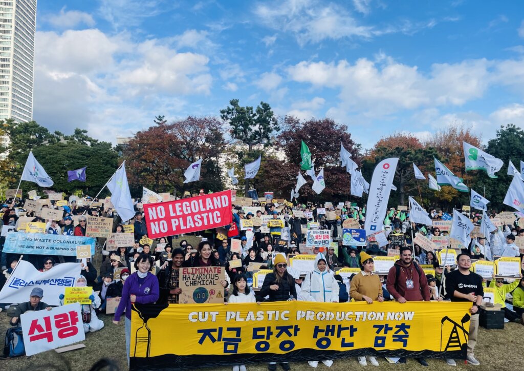Civil society gathers to call for a strong Global Plastics Treaty at the fifth round of negotiations (INC-5). Photo courtesy of Break Free From Plastic.