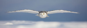 Snowy Owl in Flight Over Snow Covered Field